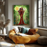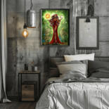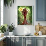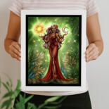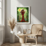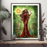 COMMAND THE COSMOS FROM YOUR WALL. Behold the Celestial Matriarch, a powerful, dark-skinned goddess who holds the balance of the universe in her hands. Cradling the radiant sun in one palm and the luminous moon in the other, she is the embodiment of cosmic harmony. Adorned in a flowing crimson dress, with long, cascading hair and mesmerizing green eyes, she stands as the vibrant heart of a lush, leafy sanctuary. This stunning fantasy illustration masterfully blends the elegance of Art Nouveau with the enchanting wonder of Magical Realism.