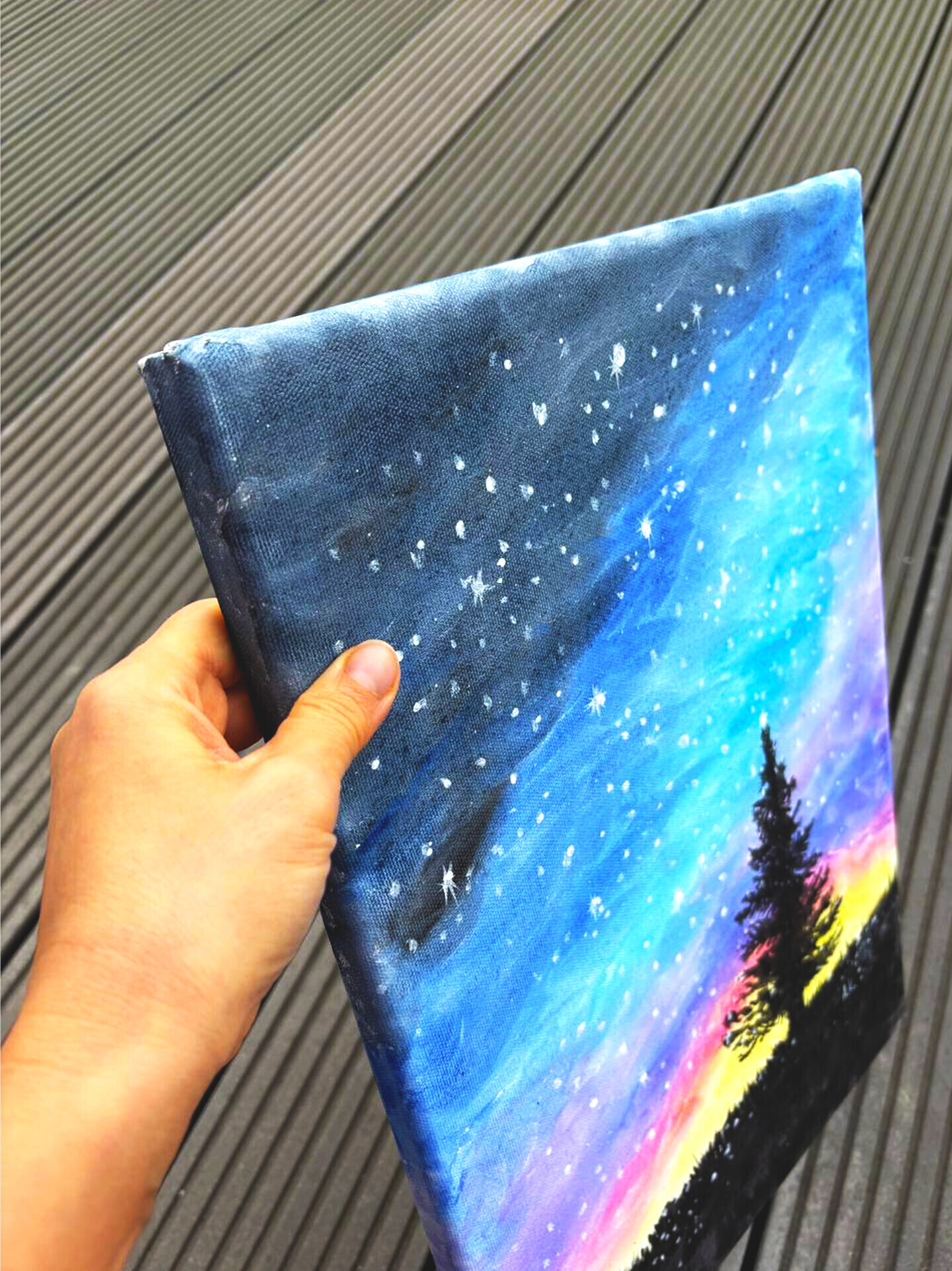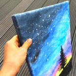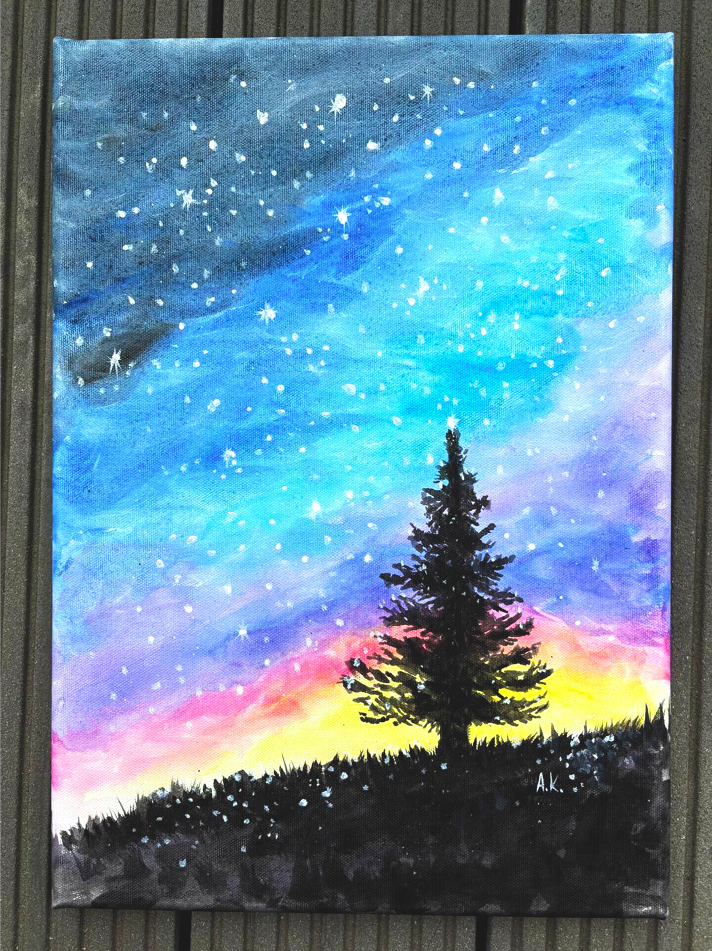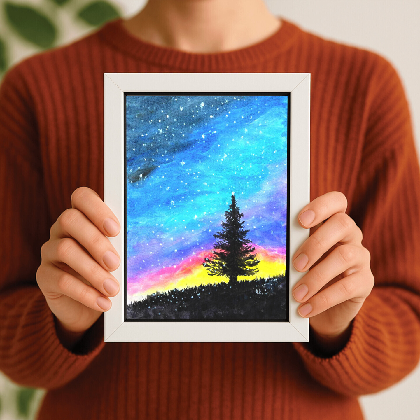 This piece continues the exploration of nighttime wonder, capturing the quiet beauty of nature under a starlit canopy. Using specialized acrylic techniques, the painting achieves the soft, fluid appearance of watercolors while maintaining the richness and depth of acrylic pigments. The careful blending of cool and warm hues creates a sense of peace and anticipation, perfectly embodying the magical atmosphere of Christmas.