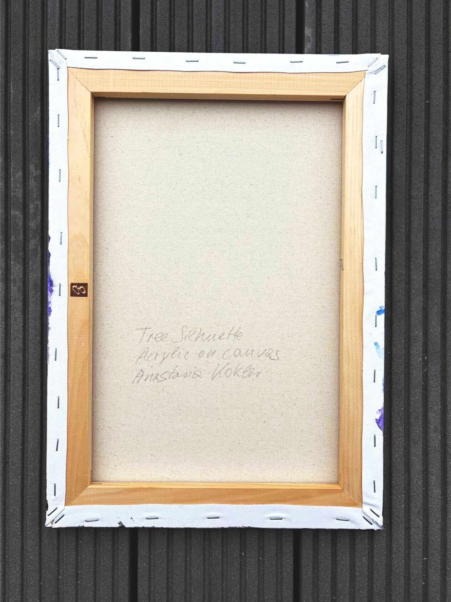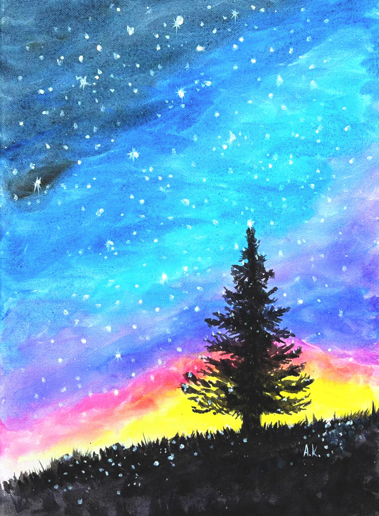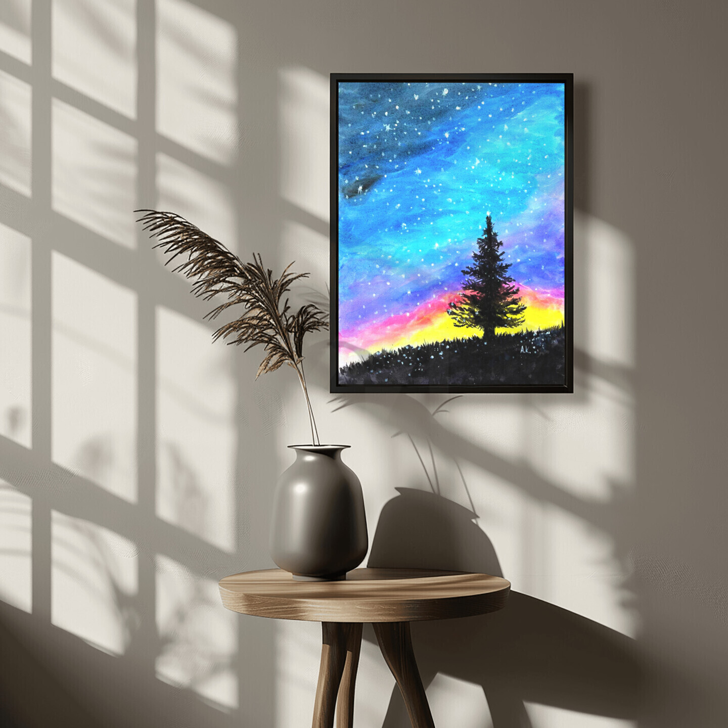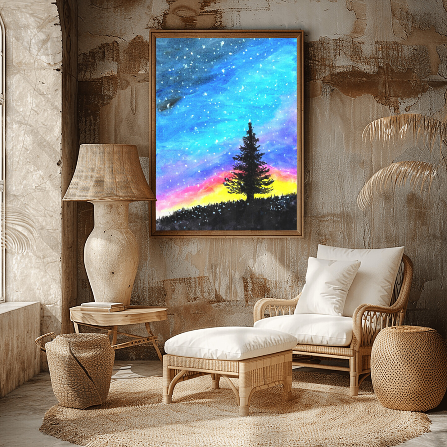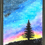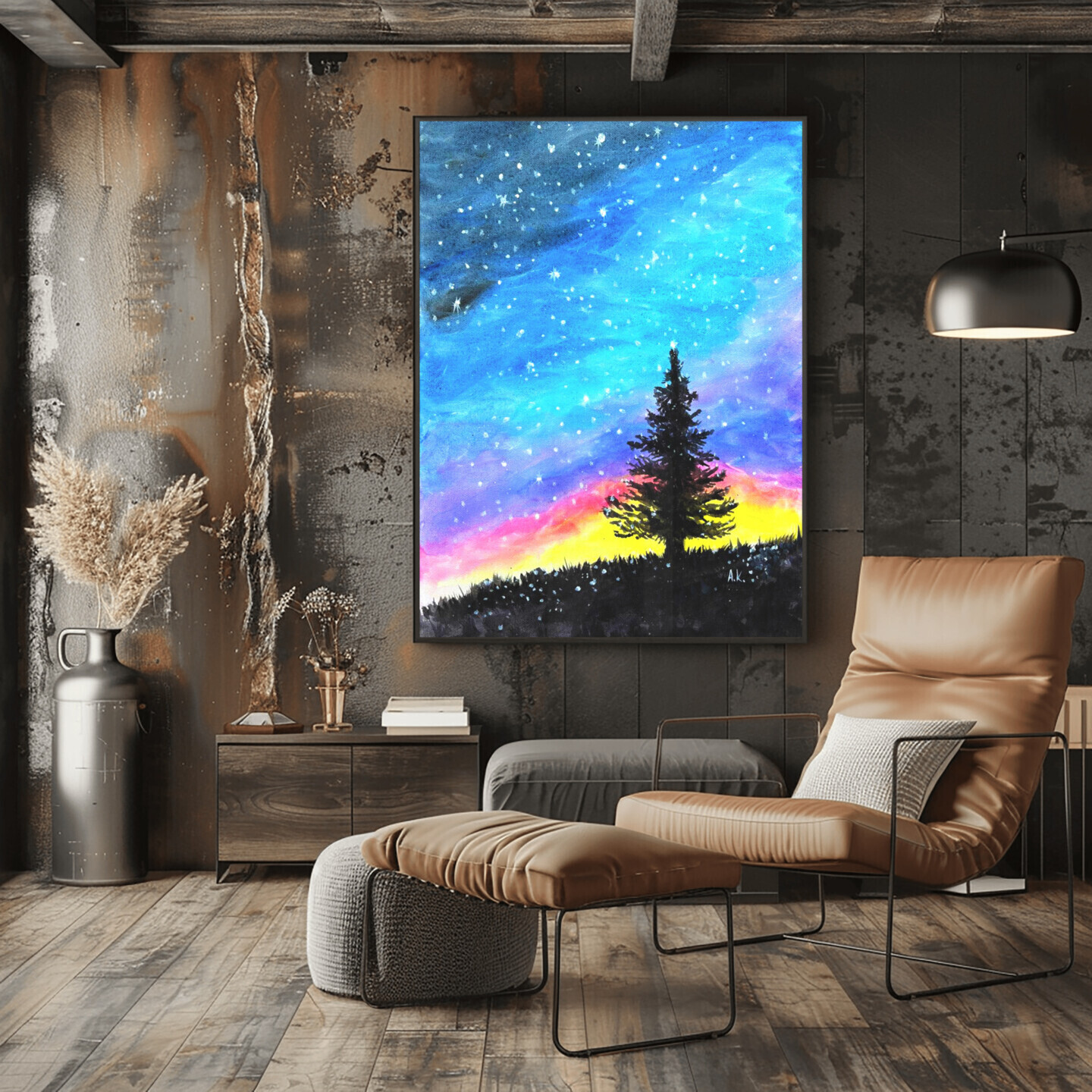 Experience the serene magic of a winter's night with "Celestial Sentinel," the second enchanting piece in the Magical Nocturnes collection. This original acrylic painting masterfully mimics the delicate flow of watercolors to depict a majestic evergreen tree standing in silent silhouette against a breathtaking celestial backdrop. The night sky comes alive with a dazzling display of stars, while the horizon glows with a gentle transition from deep blue and purple into a soft, hopeful yellow.